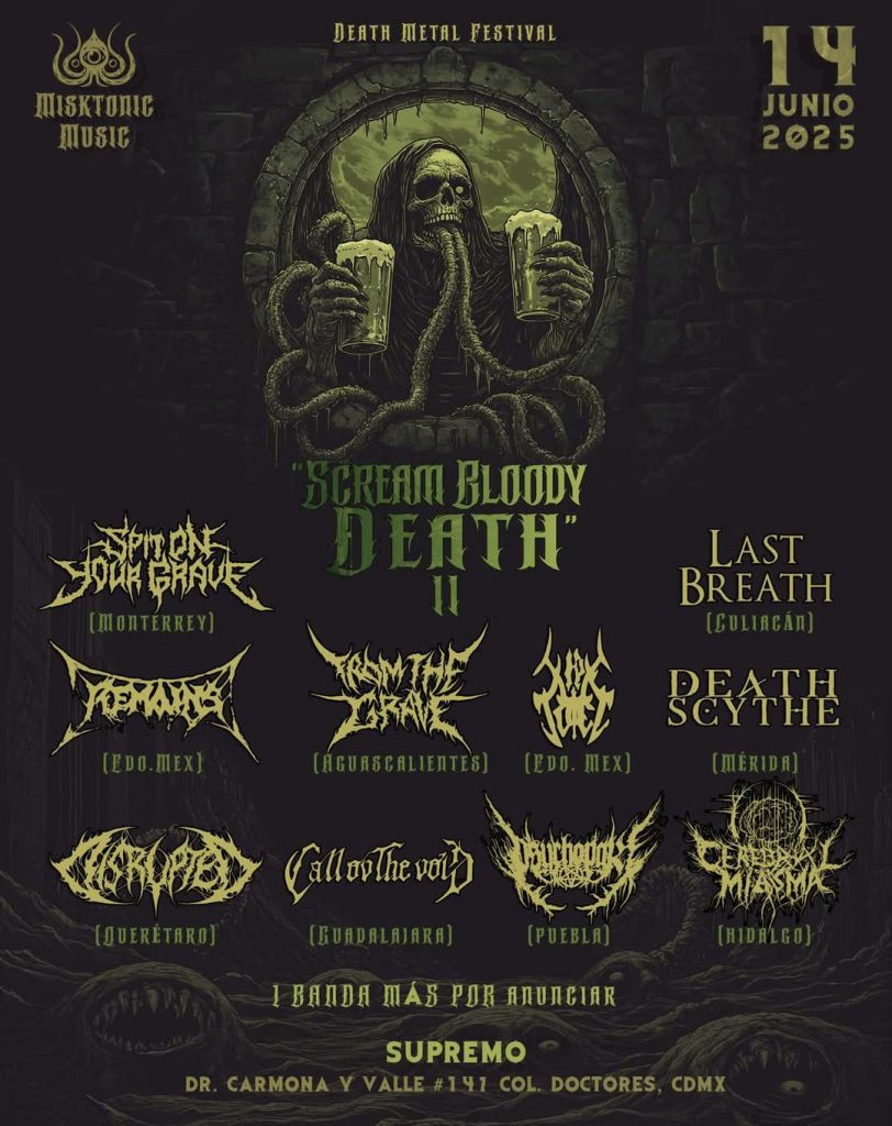¡Cultistas! Les recordamos que hoy es el último día de preventa en fase «Scream» a únicamente $450. «Scream Bloody Death ll» reúne a 11 grandes bandas de Death Metal de distintos estados de la república y pueden comprar sus boletos y la playera oficinal del evento a través del portal de Passline: