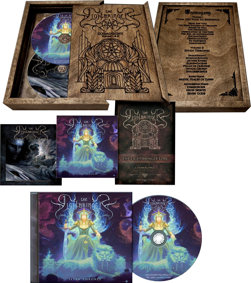 Además, ‘Seven Thrones’ tendrá una edición especial ‘Cosmogony edition’, lanzada en una caja de madera que incluye cuatro canciones de bonificación, el EP ‘From the Void to Existence’ y un folleto de 32 páginas que explora la tradición de Lightbringer, todos diseñados e ilustrados por Auraeon.