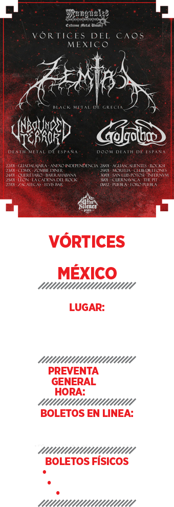 Golgotha también visita por primera vez México, y actualmente se encuentra listo para anunciar su nuevo sencillo de su próximo álbum y por su puesto, cierra el cartel del ‘Vórtices del Caos México‘, que promete ser una gira excepcional con tres leyendas del metal extremo.